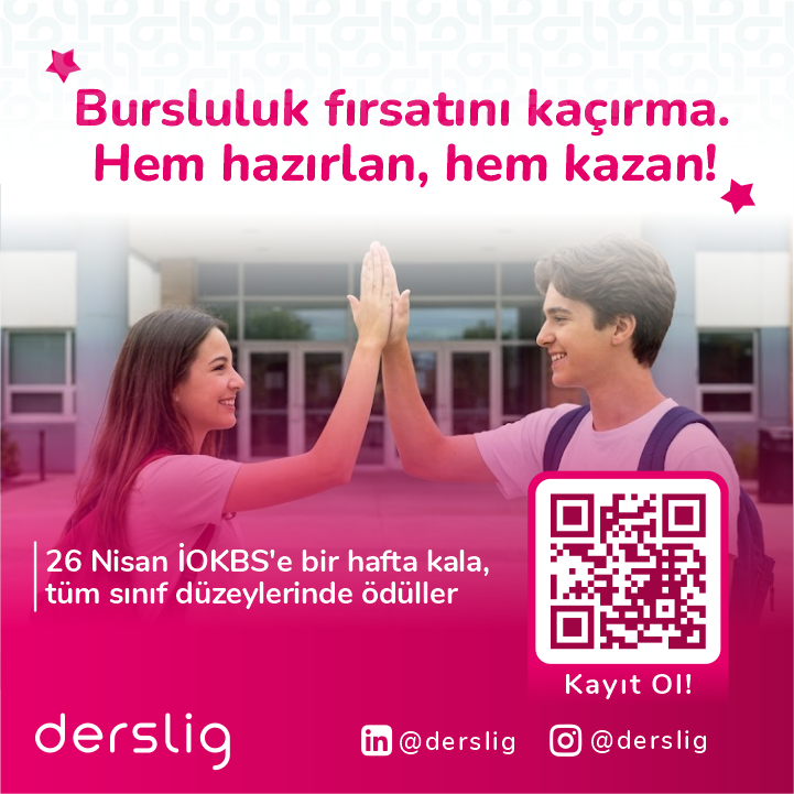Resmi İOKBS’den (İlköğretim ve Ortaöğretim Kurumları Bursluluk Sınavı) tam bir hafta önce, 19 Nisan 2026 Pazar günü Derslig olarak online bir bursluluk denemesi düzenliyoruz.