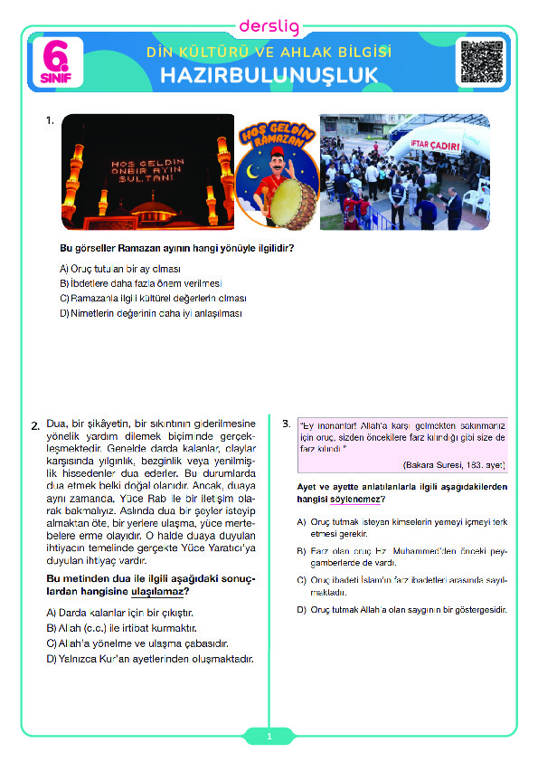 5. sınıftan 6. sınıfa Geçenler için Din Kültürü ve Ahlak Bilgisi Telafi Deneme Kitapçığı
