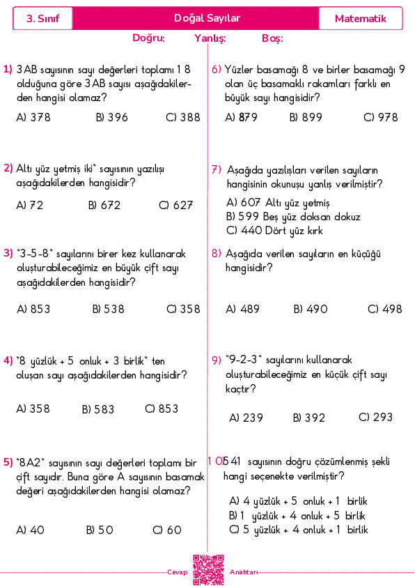 Üç Basamaklı Doğal Sayılar