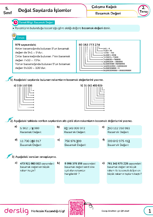 Test 5 - Basamak Değeri, Çözümleme ve Sıralama