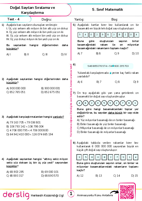 Test 5 - Basamak Değeri, Çözümleme ve Sıralama