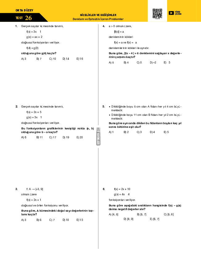 Doğrusal Fonksiyonlarla İfade Edilebilen Denklem ve Eşitsizlik test-25