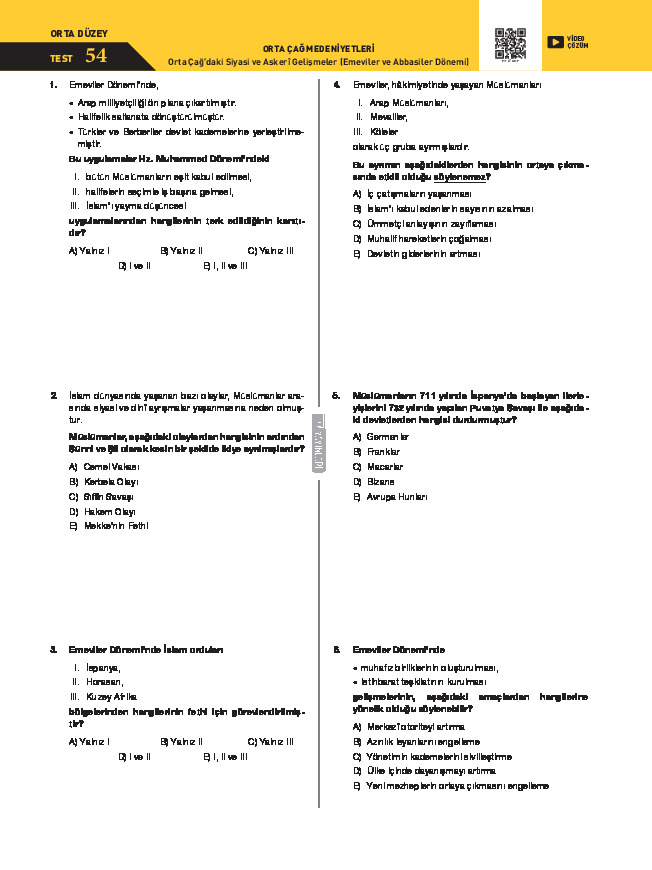 Test-52 Orta Çağ’daki Siyasi ve Askerî Gelişmeler (Emeviler ve Abbasiler Dönemi)