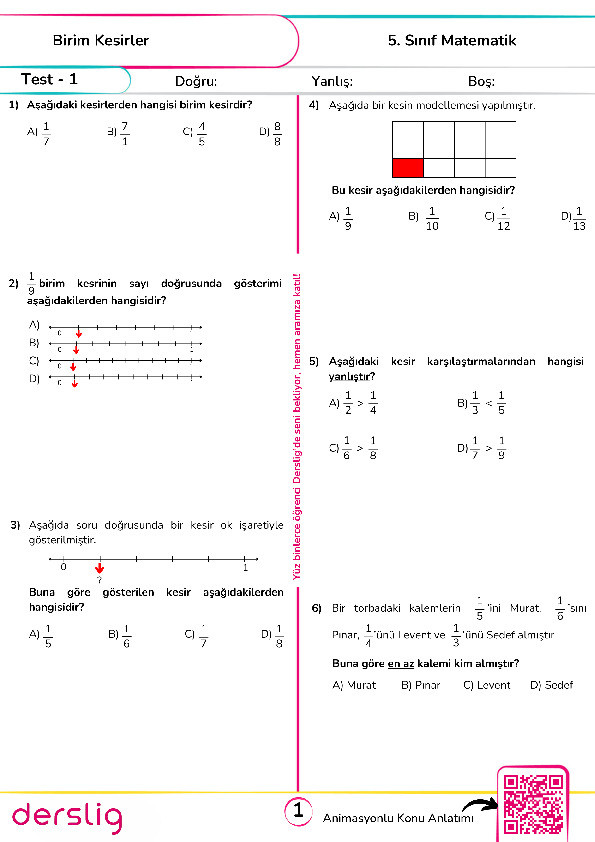Test - 2 Basit, Bileşik ve Tam Sayılı Kesirler
