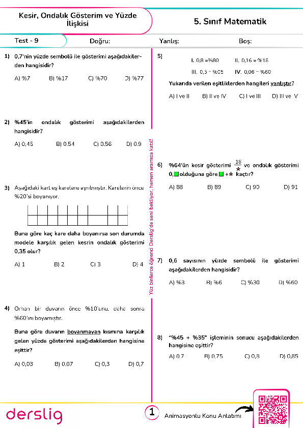 Test - 10 Ondalık Gösterim ve Yüzdeler (Yeni Nesil)