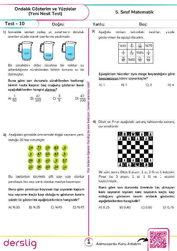 Test - 9 Kesir, Ondalık Gösterim ve Yüzde İlişkisi