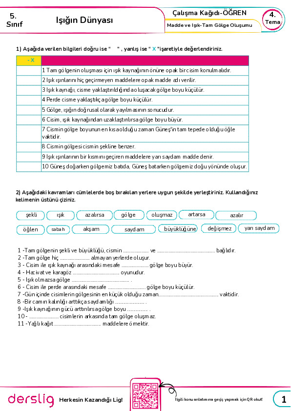 Test 12 - Madde ve Işık - Tam Gölge oluşumu