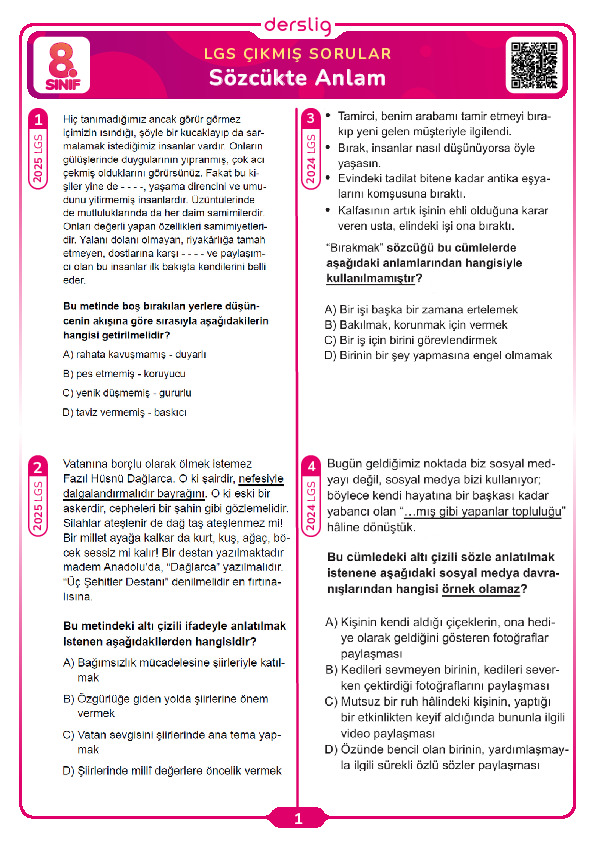 Sözcükte Anlam Test 1 (Mehmet Sarıaslan)