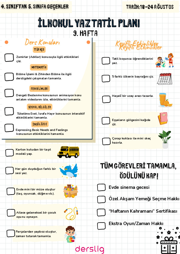 Yaz Tatil Planı 9. Hafta 3. Sınıf