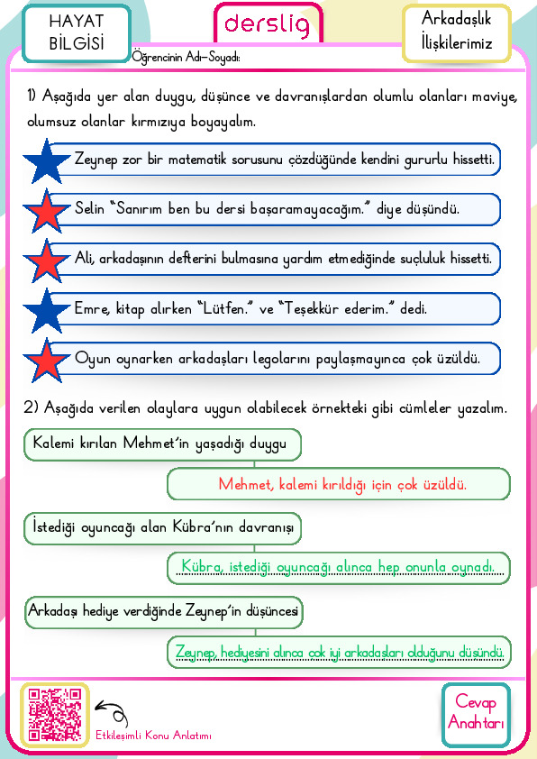 2. Sınıf İyi Arkadaşlıklar İçin Cevap AnahtarI
