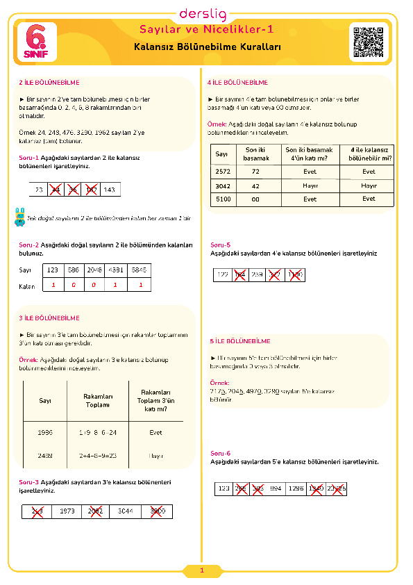 6.Sınıf 1.Tema 2.Konu (Kalansız Bölünebilme Kuralları) Çalışma Kağıdı Cevap Anahtarı