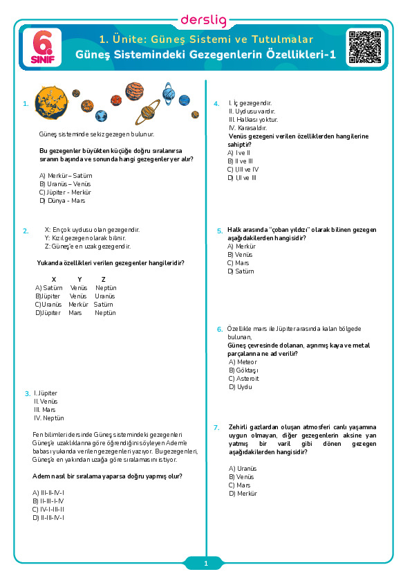 Güneş Sistemindeki Gezegenlerin Özellikleri Test- 2