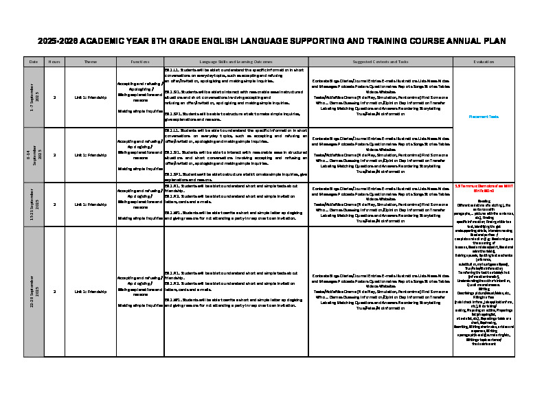 8.SINIF İNGİLİZCE DERSİ DYK YILLIK PLANI (2024-2025)