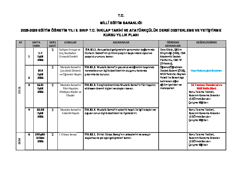8. SINIF T.C. İNKILAP TARİHİ VE ATATÜRKÇÜLÜK DERSİ DYK YILLIK PLANI (2024-2025)