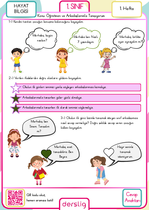1. sınıf 2. hafta ödevi cevap anahtarı