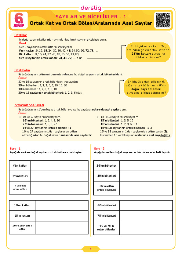 Ortak Kat - Ortak Bölen / Aralarında Asal Sayılar Test- 1