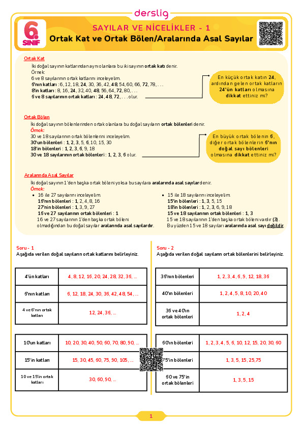 6. Sınıf 1. Tema 1. Konu Özeti(Bir Doğal Sayının Çarpanları ve Katları) Cevap Anahtarı
