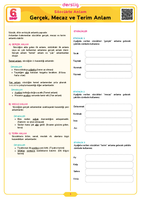 Gerçek, Mecaz ve Terim Anlam Test- 1