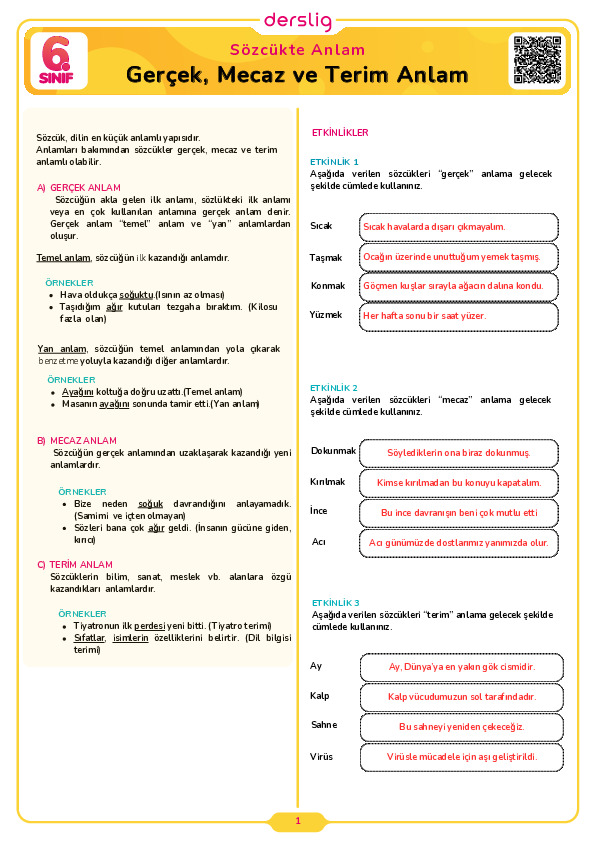 6.Sınıf 1.Tema 3.Konu (Kelime ve Kelime Gruplarının Anlamı) Çalışma Kağıdı Cevap Anahtarı