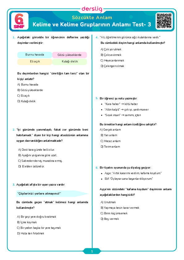 Gerçek, Mecaz ve Terim Anlam Test- 1