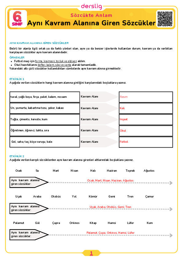 6.Sınıf 1.Tema 2.Konu (Sözcükler Arası Anlam İlişkileri) Çalışma Kağıdı Cevap Anahtarı