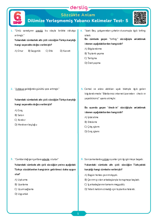 Gerçek, Mecaz ve Terim Anlam Test- 1