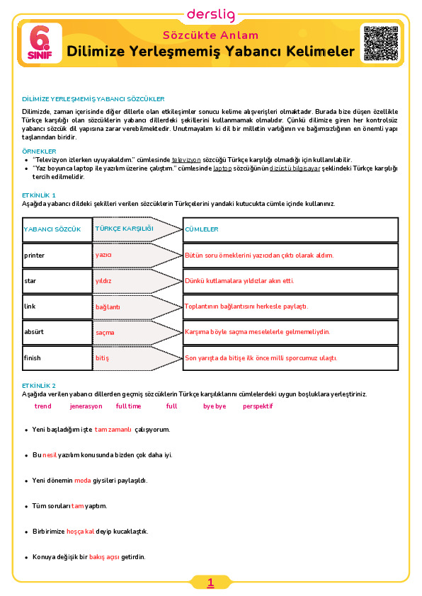 6.Sınıf 1.Tema 2.Konu (Sözcükler Arası Anlam İlişkileri) Çalışma Kağıdı Cevap Anahtarı
