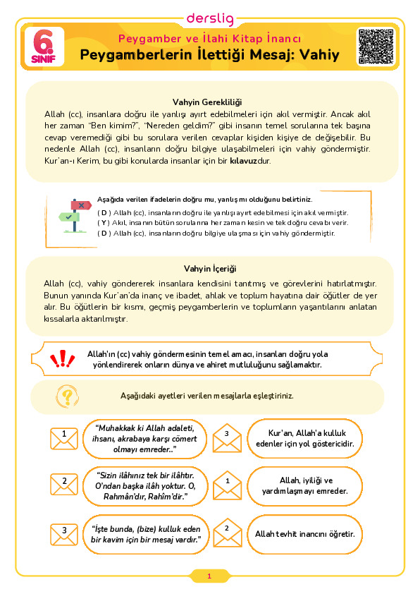 6.Sınıf 1.Tema 1.Konu (İnsanlara Rehber: Peygamber) Çalışma Kağıdı Cevap Anahtarı