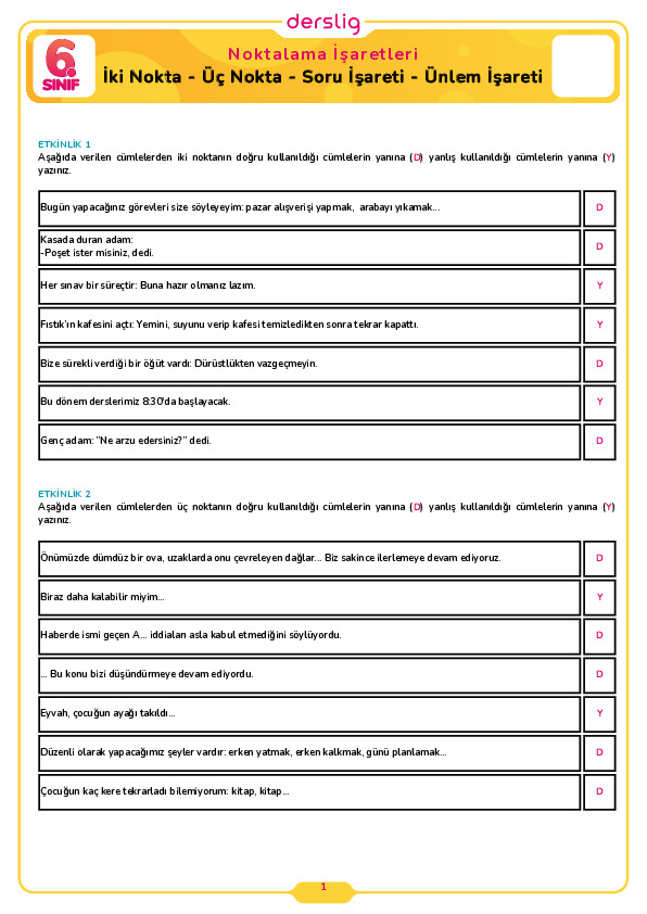 6.Sınıf 1.Tema 6.Konu (Nokta-Virgül) Çalışma Kağıdı Cevap Anahtarı