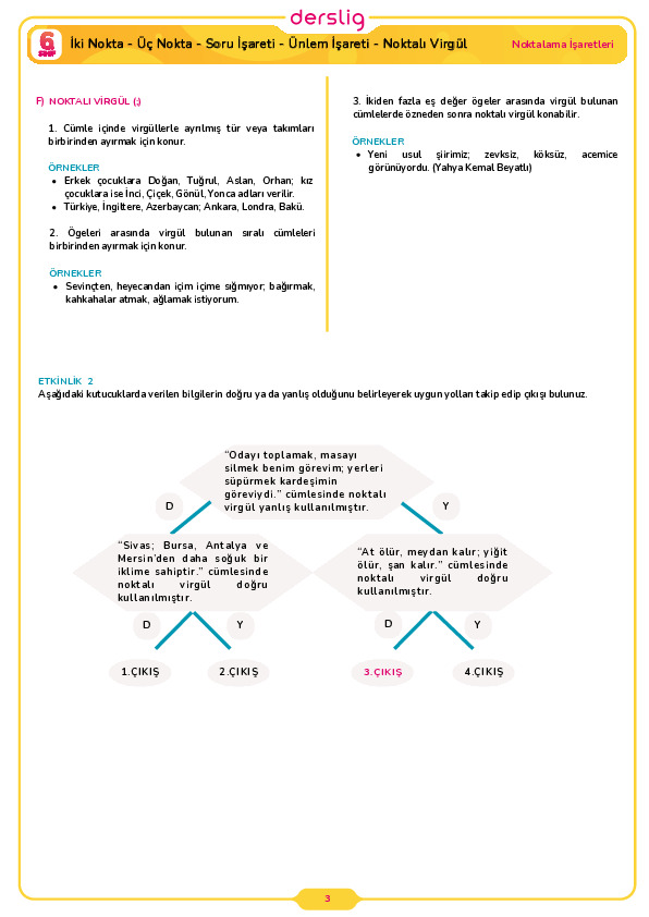 6.Sınıf 1.Tema 6.Konu (Nokta-Virgül) Çalışma Kağıdı Cevap Anahtarı