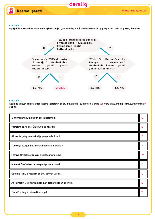 6.Sınıf 1.Tema 6.Konu (Nokta-Virgül) Çalışma Kağıdı Cevap Anahtarı