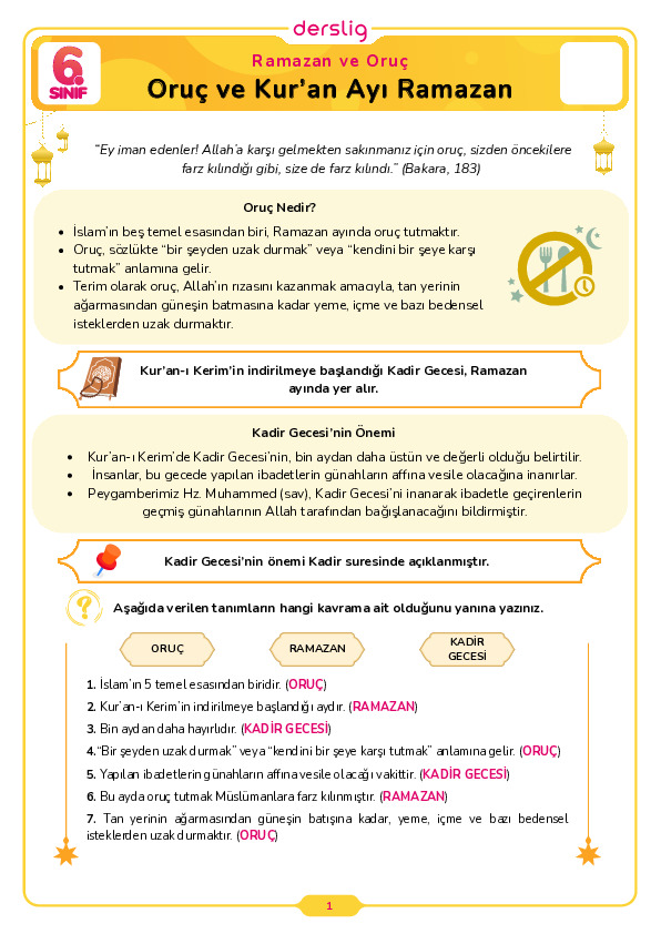6.Sınıf 1.Tema 2.Konu (Peygamberlerin İlettiği Mesaj: Vahiy) Çalışma Kağıdı Cevap Anahtarı