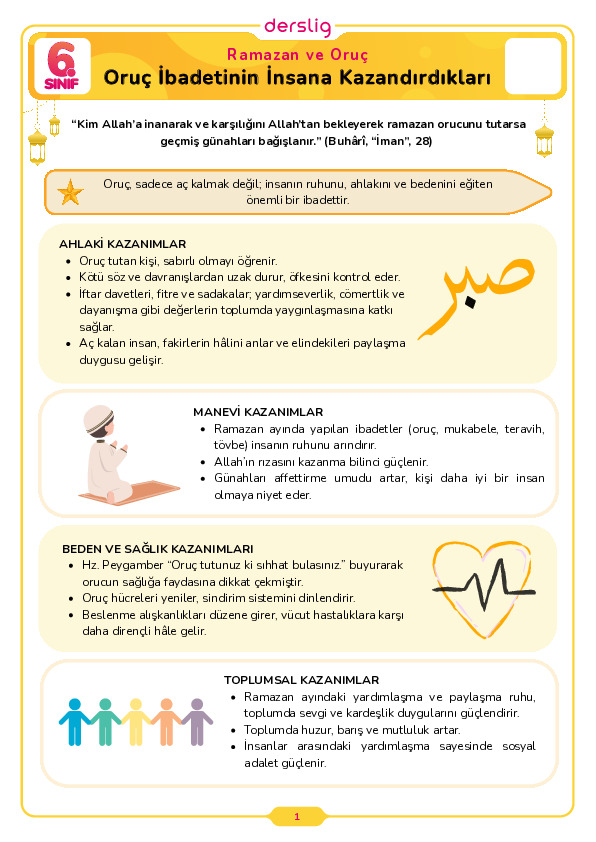6.Sınıf 1.Tema 1.Konu (İnsanlara Rehber: Peygamber) Çalışma Kağıdı Cevap Anahtarı