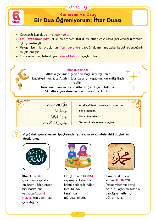 6.Sınıf 1.Tema 1.Konu (İnsanlara Rehber: Peygamber) Çalışma Kağıdı Cevap Anahtarı