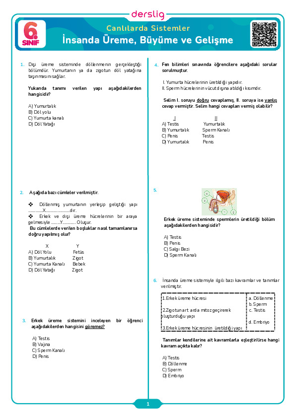 Hayvanlarda Üreme, Büyüme ve Gelişme Test- 1