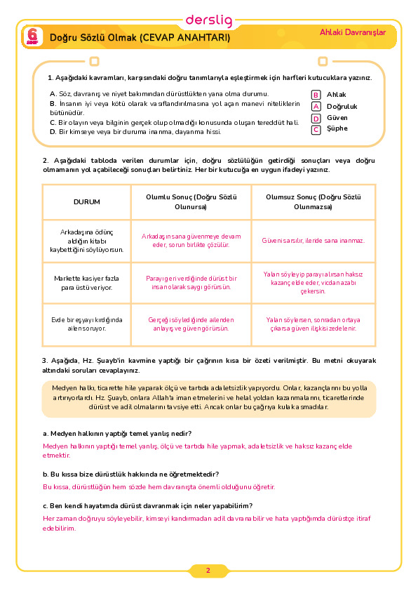 2. Sınıf 6. Hafta Cevap Anahtarı