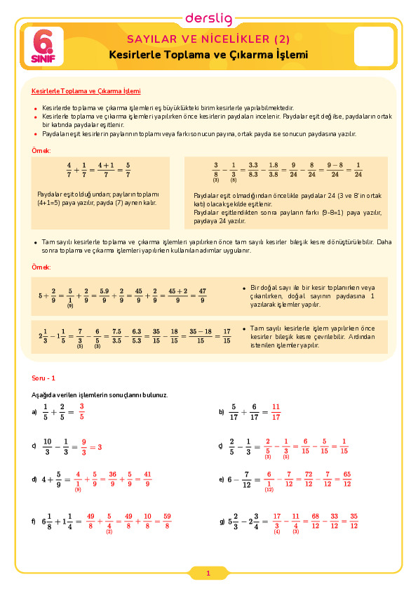 5. Sınıf 4. Tema 3. Konu Özeti(Basit, Bileşik ve Tam sayılı Kesirler) Cevap Anahtarı