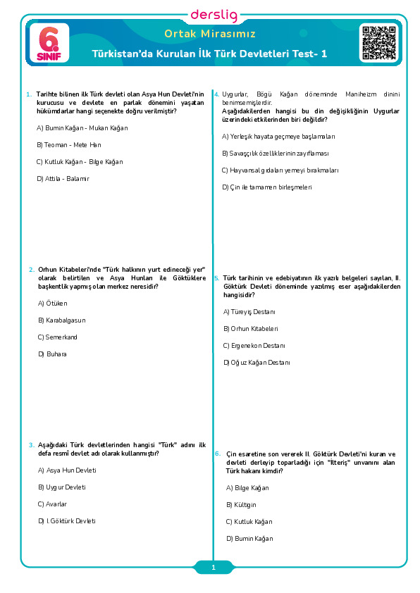 Türkistan’da Kurulan İlk Türk Devletleri Test- 2