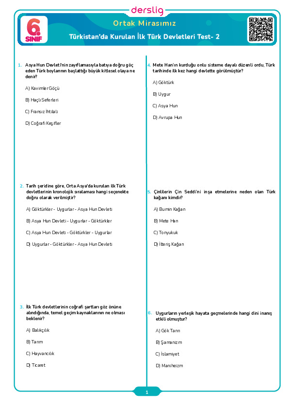 Türkistan’da Kurulan İlk Türk Devletleri Test- 1