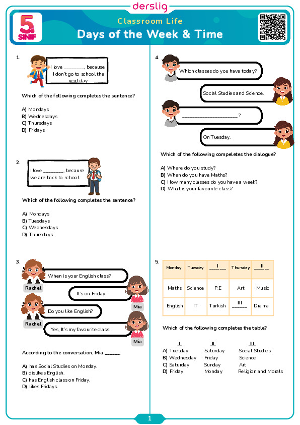 Days of the Week & Time Vocabulary Quiz