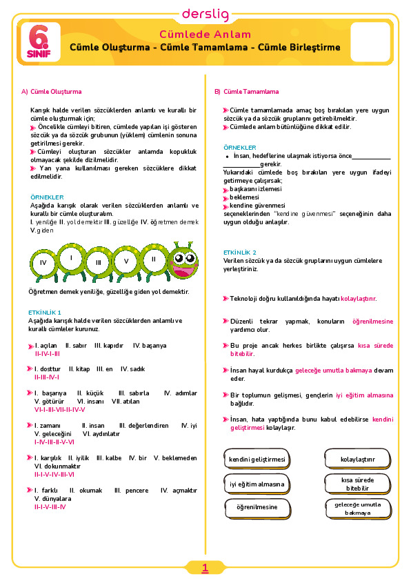 6.Sınıf 1.Tema 3.Konu (Kelime ve Kelime Gruplarının Anlamı) Çalışma Kağıdı Cevap Anahtarı