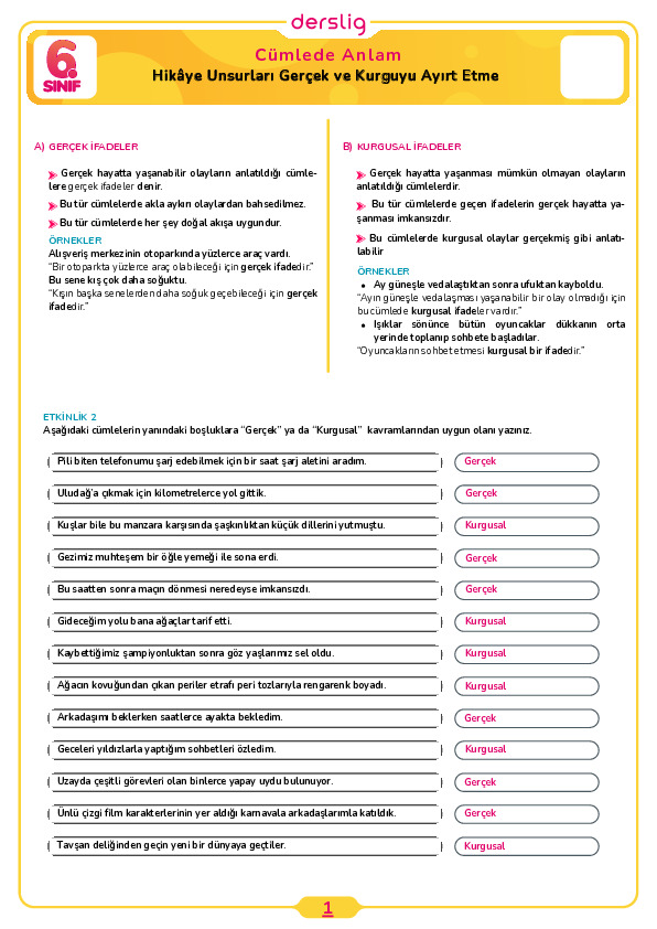 6.Sınıf 1.Tema 1.Konu (Gerçek, Mecaz ve Terim Anlam) Çalışma Kağıdı Cevap Anahtarı
