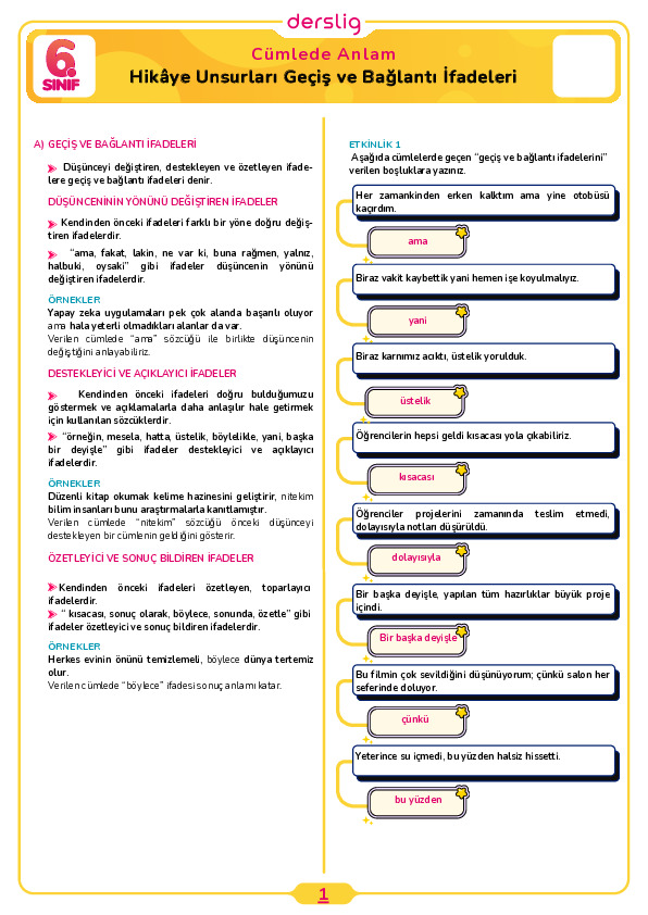 6.Sınıf 1.Tema 3.Konu (Kelime ve Kelime Gruplarının Anlamı) Çalışma Kağıdı Cevap Anahtarı