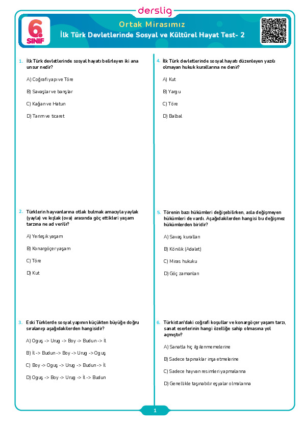 İlk Türk Devletlerinde Sosyal ve Kültürel Hayat Test- 1