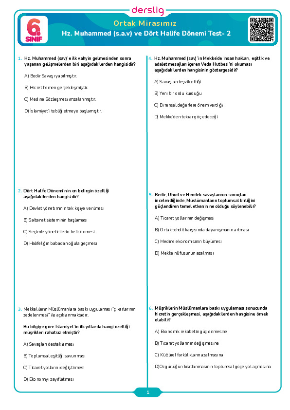 Hz. Muhammed (s.a.v) ve Dört Halife Dönemi Test- 1