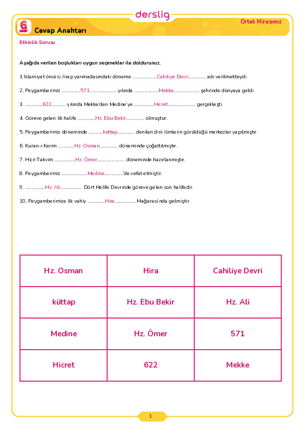 6.Sınıf 1.Tema 1.Konu (İnsanlara Rehber: Peygamber) Çalışma Kağıdı Cevap Anahtarı