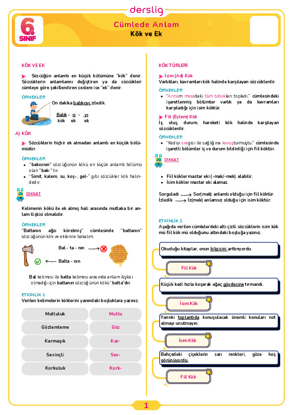 6.Sınıf 1.Tema 3.Konu (Kelime ve Kelime Gruplarının Anlamı) Çalışma Kağıdı Cevap Anahtarı