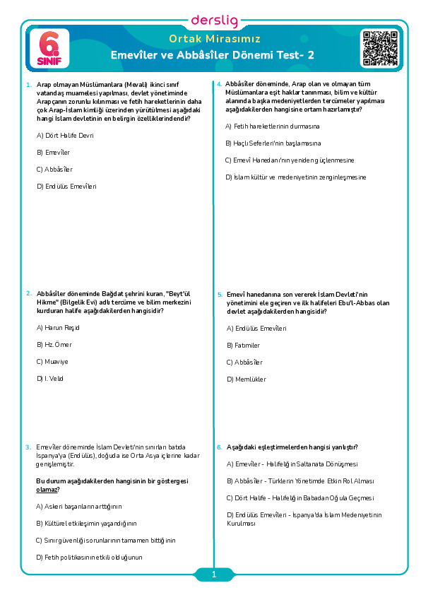 Emevîler ve Abbâsîler Dönemi Test- 1