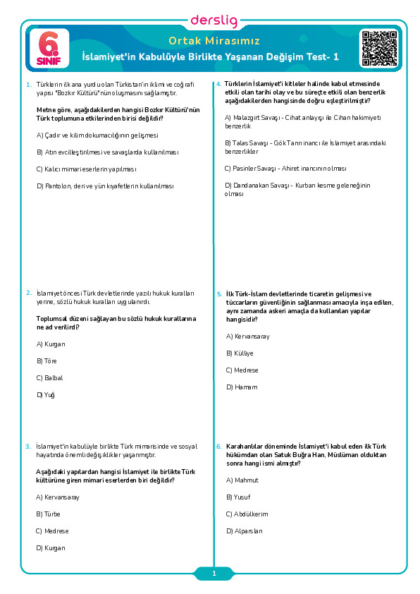 İslamiyet'in Kabulüyle Birlikte Yaşanan Değişim Test- 2