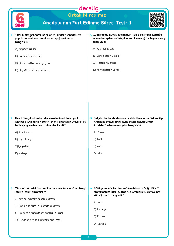Anadolu'nun Yurt Edinme Süreci Test- 2